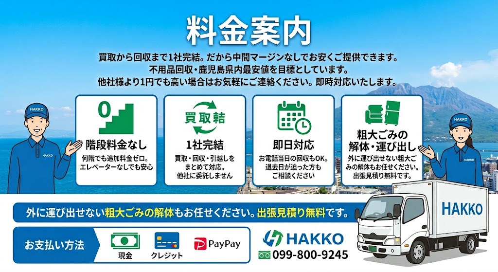 不用品回収・鹿児島県内最安値を目標としておりますので、お見積もり金額が他社様より1円でも高い場合にはお気軽にご連絡ください。即時対応させていただき、格安での不用品回収サービスを提案させていただきます。