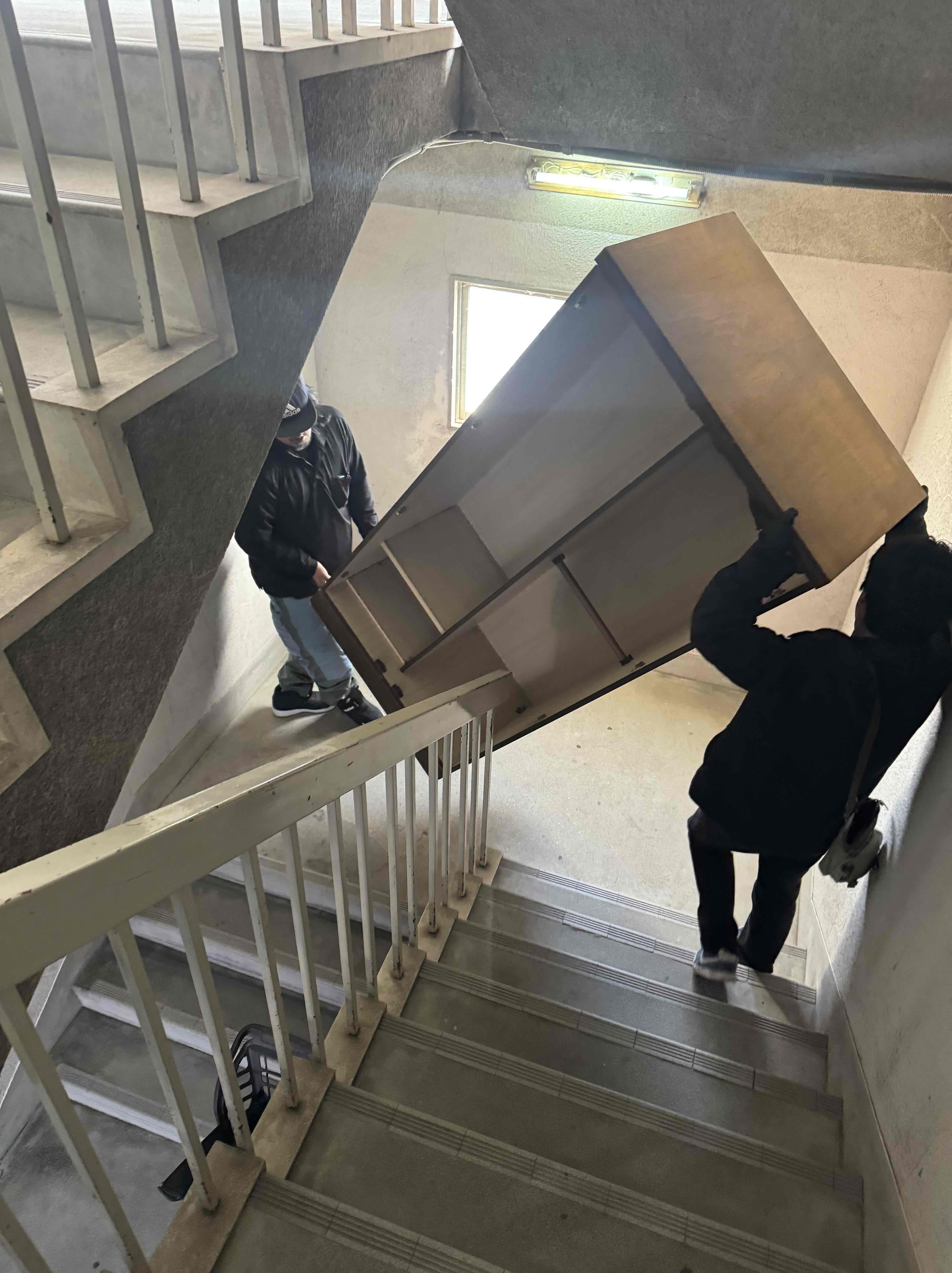 - 階段3階からのスピーディーな搬出エレベーターがない建物でも、スタッフ3名のチームワークで安全に運び出しました。大型のタンスも、階段の角や壁を傷つけないよう慎重かつ迅速に対応いたします。