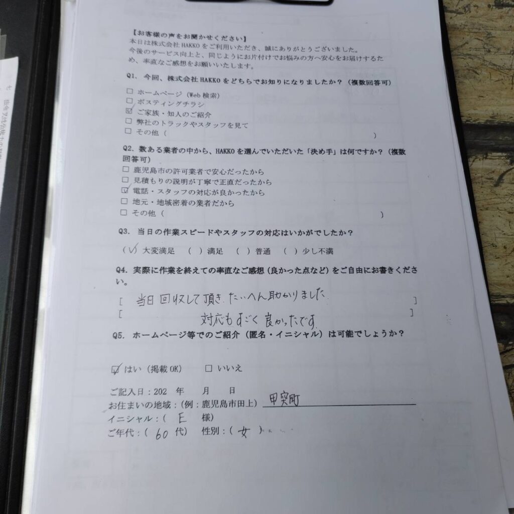 今回ご依頼いただいたのは、鹿児島市甲突町のマンション9階にお住まいのE様(60代・女性)です。ご家族のご紹介でHAKKOをお知