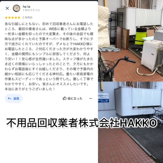 契約で本日までに部屋を空っぽにしないといけないとの事でお品物を聞いて冷蔵庫、洗濯機、ベット。パソコンデスク、イス、チェスト、ハンガーラックの回収との内容でしたので金額25000円税別とお伝えしました。