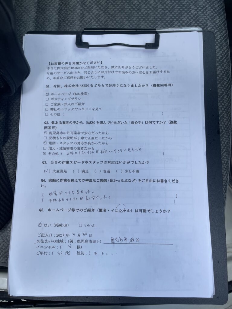 作業終了後、Y様よりアンケートにご協力いただきました。