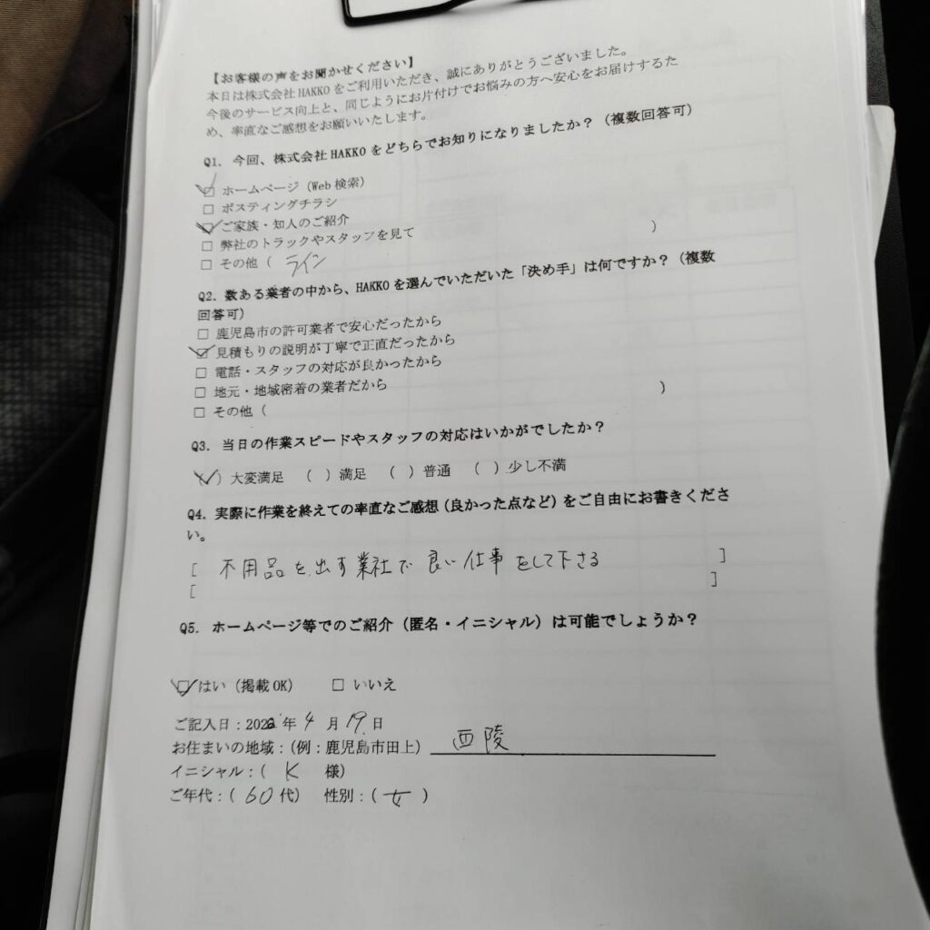 K様には、当日の作業スピードやスタッフの対応についても「大変満足」と最高評価をいただきました。