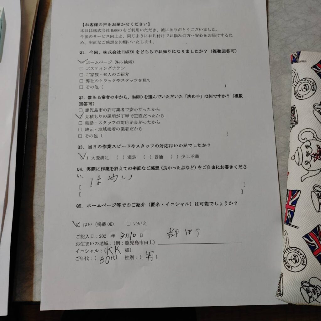 作業終了後、アンケートにご協力いただきました。 数ある業者の中からHAKKOを選んでいただいた決め手は「見積もりの説明が丁寧で正直だったから」とのこと。