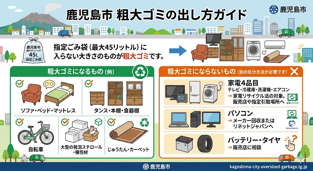 鹿児島市では、指定ごみ袋(最大45リットル)に入らない大きさのものが粗大ゴミの対象です。