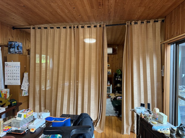 お伺いしてリビングを仕切るカーテンと思ってなかったのでひとりでお伺いしてさてどうしたものかと考えながら、何とかひとりで設置させていただきました。