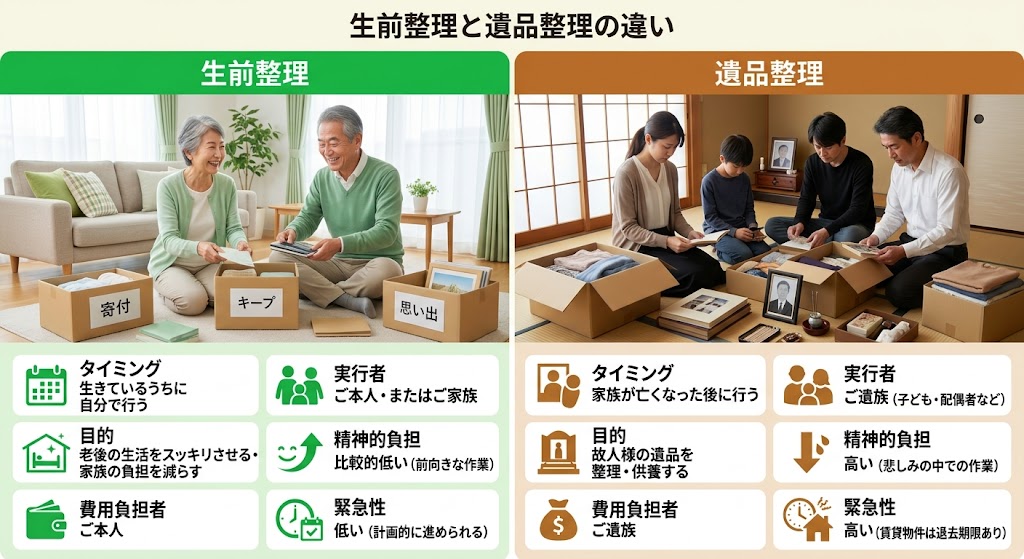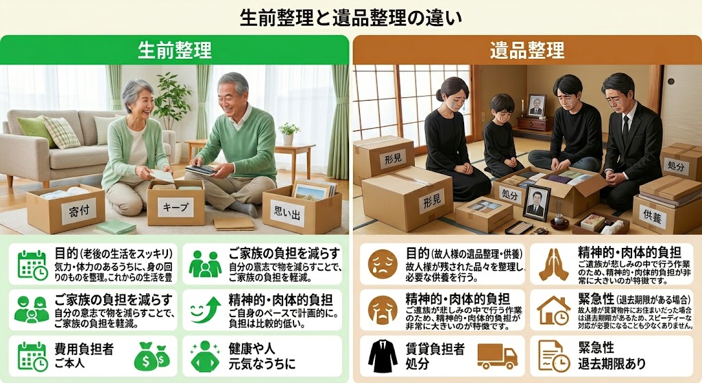 「生前整理と遺品整理、何が違うの?」「今のうちから片付けたいけれど、どちらを頼めばいいの?」