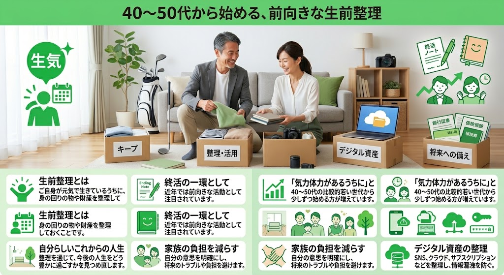 「終活」の一環として行われることが多く、近年では「気力も体力もあるうちに」と、40〜50代の比較的若い世代から少しずつ始める方も増えています。