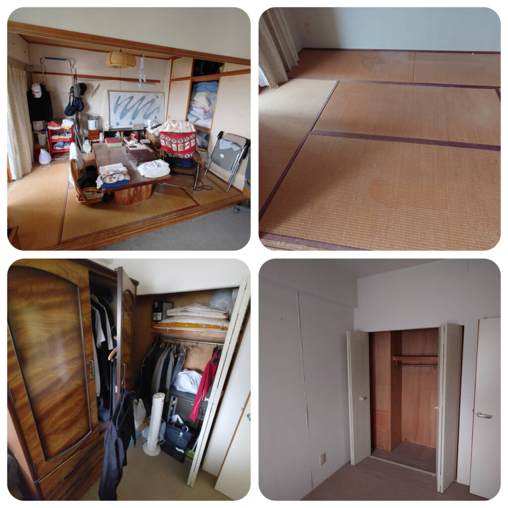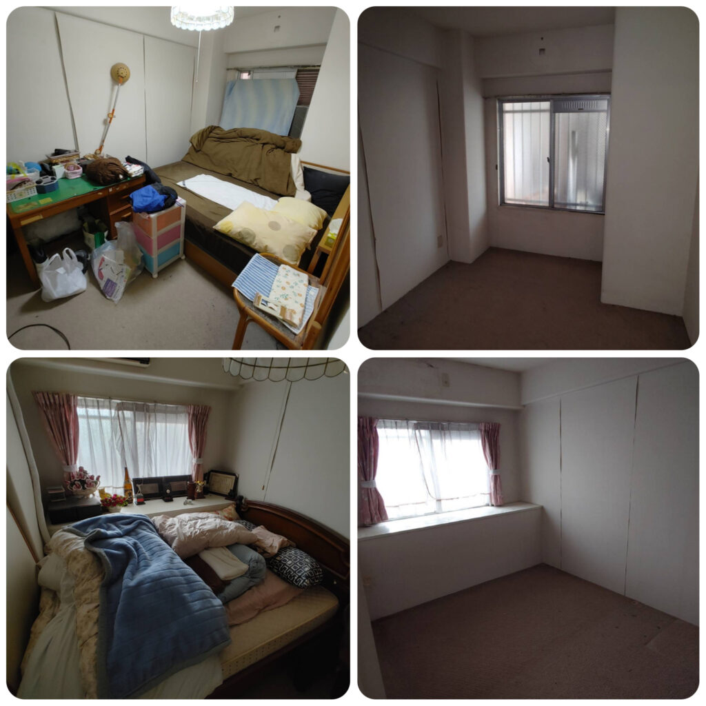 作業当日は、スタッフ4名体制でお伺いしました。 3LDKのお部屋には、大型のタンスやベッド、座卓などの家具類をはじめ、押し入れいっぱいの布団や衣類、日用品が多数ありました。