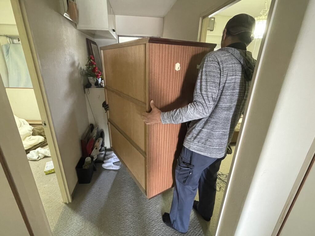 今回は大きなタンスやベッドフレームなど重量のある家具も多くありましたが、壁や床を傷つけないよう慎重に搬出いたしました。