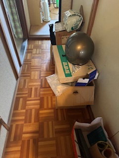廊下に段ボール、古い箱、野球ボールのようなオブジェ、よく分からない紙袋。歩くスペースがかろうじてある、くらいの状態。
